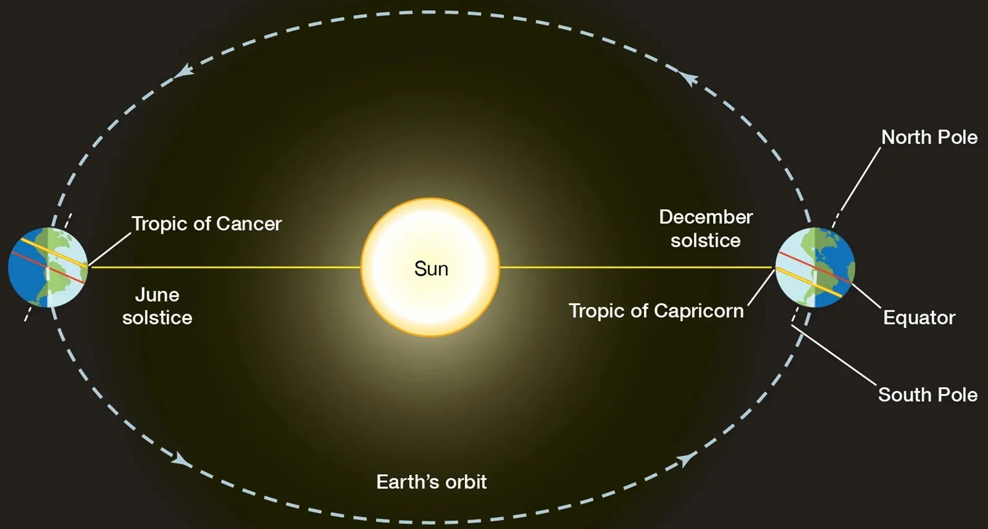 The Winter Solstice (in the Northern Hemisphere) is the date in which the North Pole reaches its maximum tilt away from the sun (and its lowest point in the sky for us). The sun is directly over the Tropic of Capricorn (at 9:27PM Central on December 21st, exactly) thus marking our shortest day. At the same time, in the South Hemisphere, it is their Summer Solstice and their longest day of the year. See figure below.